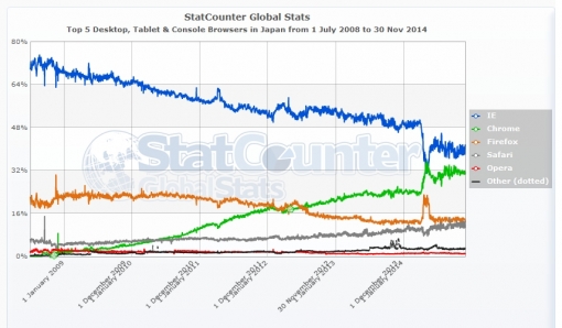 これは、2008年1月から2014年11月までの日本国内のブラウザシェアを表したグラフですが、青がIE、緑がChrome、オレンジがFirefoxです。